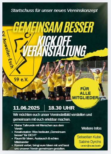 📢 #GemeinsamBesser – Leitbild-Workshop beim SV Auweiler-Esch 💬⚽                                                    Was für ein inspirierender Nachmittag im Vereinsheim des SVAE! Über 30 Teilnehmer:innen – Kinder, Spieler:innen, Eltern, Trainer:innen und Vorstandsmitglieder – kamen zusammen, um unser Vereinsleitbild #GemeinsamBesser mit Leben zu füllen.                                                              Nach einer spannenden Einführung in die Leitbilder großer Bundesliga-Clubs durch Jugendleiter Sebastian Kube zeigte Sabine Dyrchs (Mutter zweier SVAE-Kinder), wie wichtig ein lebendiges Leitbild für unseren Vereinsalltag ist.                                                              🎨 Erste kreative Ideen wurden vorgestellt:                                                              Graffiti-Workshop für unsere Pänz mit den Spielervätern Denis Papadopoulos & Markus Decker – hier dürfen die Kids das Leitbild künstlerisch umsetzen.                                                              Leitbild-Expert:innen unter den Eltern sollen in den Teams Alltagsbeispiele sammeln, in denen #GemeinsamBesser gelebt (oder vermisst) wird.                                                              Ein freiwilliger Trainer:innen-Workshop ist geplant, um pädagogische Impulse für Teamgeist und Fairness zu geben.                                                              Anschließend wurden alle Gäste selbst aktiv: Es entstanden viele weitere tolle Ideen, die nun Schritt für Schritt umgesetzt werden. 💡💪                                                              Nächster Meilenstein: Die Erweiterung auf unsere anderen Sportabteilungen – die ersten Gruppen sind bereits in der Planung. Weiter geht's in kleineren Projektteams, im Dezember findet dann wieder das nächste größere Treffen für alle Mitglieder zu #GemeinsamBesser statt.                                                              Der SVAE lebt #GemeinsamBesser – danke an alle Beteiligten! ❤️🤍                                                              #SVAE #Vereinsleben #Leitbild #Zusammenhalt #Mitgestalten #KinderStärken #ElternEngagement #FairPlay #Vereinsliebe